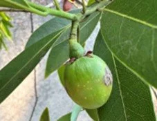 Center: Greenish avocado-like fruits form in summer and ripen in fall.