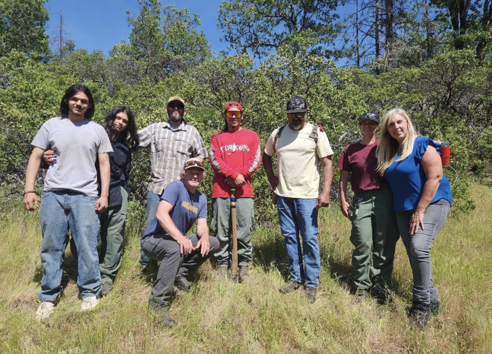 ERRP contractor Steve Brown at center with HIS crew (L to R) Isiah Lucas, Carolyn Lucas, Monroe Lucas, Tom Campbell, Jodi Lucas and Rachael Campbell at Cahto Creek Ranch meadow. 5/28/24. Photo by Pat Higgins.